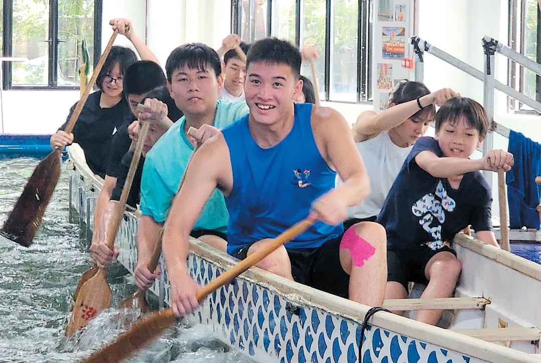 香港裘錦秋中學(xué)龍舟隊(duì)隊(duì)員與新會(huì)泓達(dá)堂陳皮龍舟隊(duì)隊(duì)員一起訓(xùn)練扒龍舟。