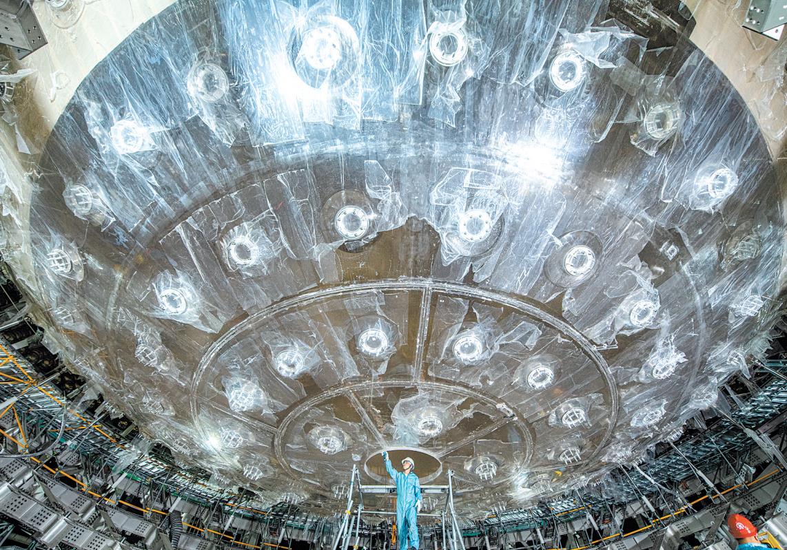 ????江門中微子實驗室作為中國科學(xué)院和廣東省共同建設(shè)的大科學(xué)裝置,是我國主導(dǎo)的大型國際科學(xué)合作項目,以測定中微子質(zhì)量順序、精確測量中微子混合參數(shù)為主要科學(xué)目標(biāo),并進(jìn)行其他多項科學(xué)前沿研究。其核心探測設(shè)備是一個位于地下700米的液體閃爍體探測器,探測器放置在地下實驗大廳內(nèi)一個44米深的池子中央,由直徑41.1米的不銹鋼框架、直徑35.4米的有機(jī)玻璃球,以及2萬噸液體閃爍體、4.5萬個光電倍增管等關(guān)鍵部件組成。