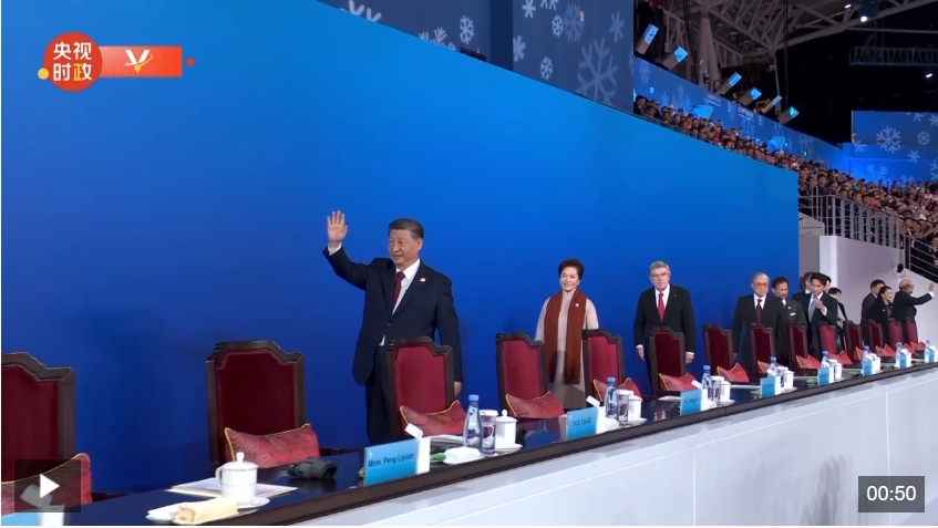 ??19時58分,在《和平——命運共同體》的樂曲聲中,習(xí)近平和夫人彭麗媛,同國際奧委會主席巴赫、亞奧理事會第一副主席霍震霆等步入主席臺,向觀眾揮手致意。全場響起長時間的熱烈掌聲。