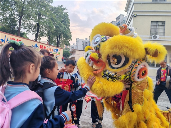 臺山市四九鎮(zhèn)中心小學(xué)學(xué)生“摸摸獅頭”。