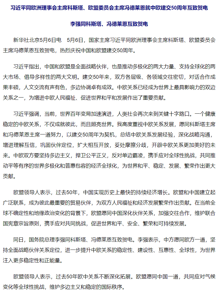 習(xí)近平同歐洲理事會(huì)主席科斯塔、歐盟委員會(huì)主席馮德萊恩就中歐建交50周年互致賀電