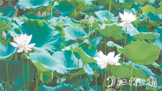 ????江門日?qǐng)?bào)訊 (文/圖 記者/何榕 陳嬋)時(shí)下,外海街道茶庵古寺里的大片荷花開始綻放,吸引了不少市民游客前往觀賞、打卡。????記者昨日經(jīng)茶庵古寺門坊,沿蜿蜒的石板路前行,只見(jiàn)荷花池中,荷葉田田,層層疊疊,粉色的、白色的荷花在綠色荷葉間亭亭玉立,與古寺的飛檐斗拱相互映襯,美麗如畫。