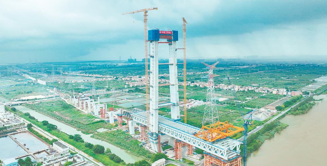 ????新建深江高鐵正線全長約116公里,其中中鐵大橋局承建的8標段洪奇瀝水道公鐵合建段主橋長1.41公里,主跨808米,采用世界首創(chuàng)的公鐵合建超短邊跨鋼混箱桁組合梁體系,是全線關鍵控制性工程。大橋上層為八車道城市快速公路,下層為四線高速鐵路。