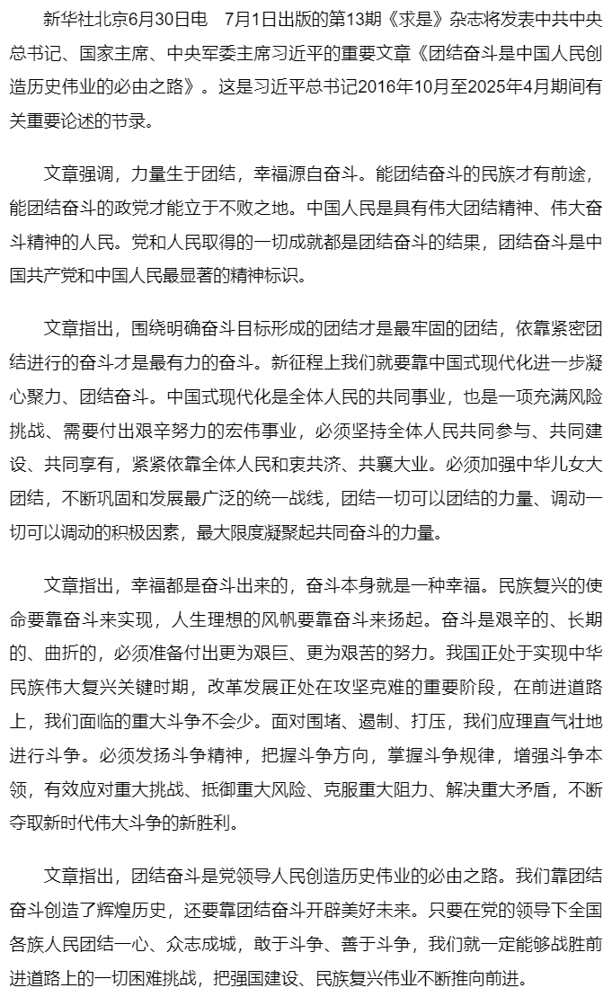 《求是》雜志發(fā)表習近平總書記重要文章《團結奮斗是中國人民創(chuàng)造歷史偉業(yè)的必由之路》