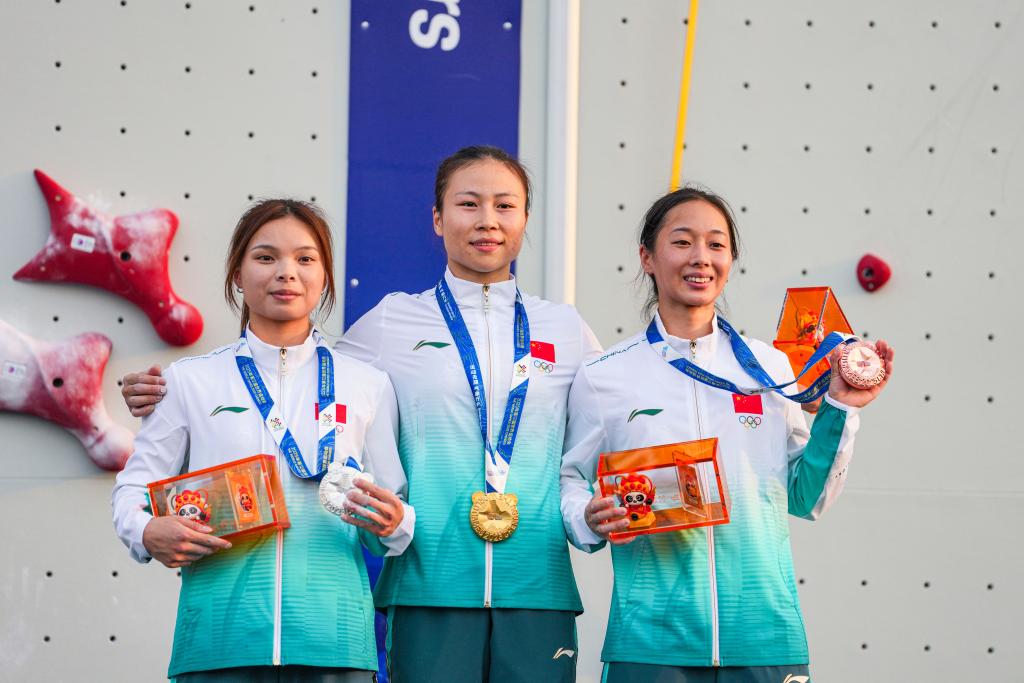 8月14日,2025年成都世運(yùn)會(huì)攀巖女子速度個(gè)人賽中,中國(guó)選手包攬獎(jiǎng)牌。圖為鄧麗娟(中)、覃于妹(左)和周婭菲在頒獎(jiǎng)儀式上合影。新華社記者 丁增尼達(dá) 攝