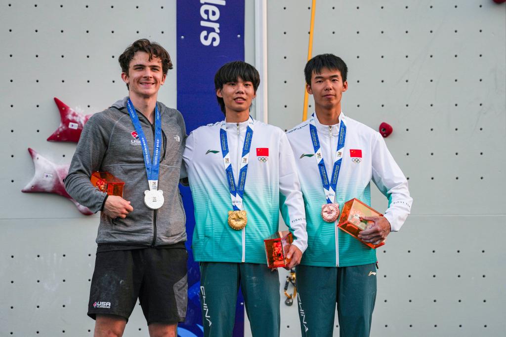 8月14日,冠軍中國(guó)選手儲(chǔ)守宏(中)、亞軍美國(guó)選手沃森(左)和季軍中國(guó)選手龍見(jiàn)國(guó)在攀巖男子速度個(gè)人賽頒獎(jiǎng)儀式上合影。新華社記者 丁增尼達(dá) 攝