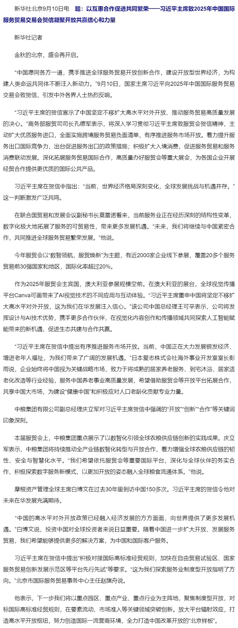以互惠合作促進(jìn)共同繁榮——習(xí)近平主席致2025年中國(guó)國(guó)際服務(wù)貿(mào)易交易會(huì)賀信凝聚開放共贏信心和力量