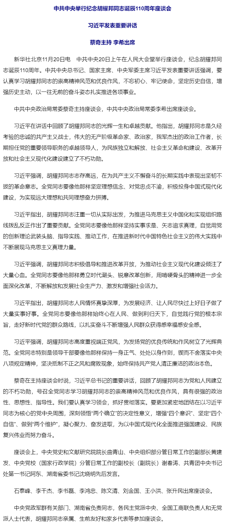 中共中央舉行紀念胡耀邦同志誕辰110周年座談會 習近平發(fā)表重要講話