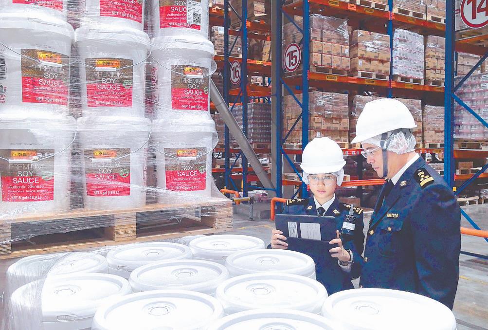 海關(guān)關(guān)員對(duì)出口調(diào)味品進(jìn)行監(jiān)管。