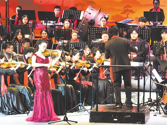 ????現(xiàn)場,民族經(jīng)典曲目盡顯深厚底蘊(yùn),《春節(jié)序曲》洋溢歡騰喜樂,《瑤族舞曲》勾勒民族風(fēng)情;西方經(jīng)典作品各具特色,《查爾達(dá)什》的吉普賽風(fēng)情在琴弦上奔流,莫扎特二重唱盡顯喜劇智慧。此外,中國竹笛與西方管弦樂器共同演繹的《掛紅燈》恢弘大氣。