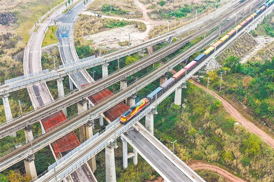 ????圖為當日,鐵海聯(lián)運“重慶造”新能源汽車專列在重慶果園港魚嘴站順利發(fā)車(無人機照片)。新華社發(fā)