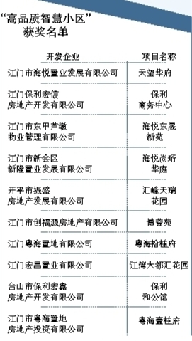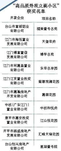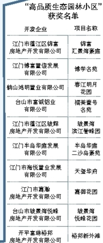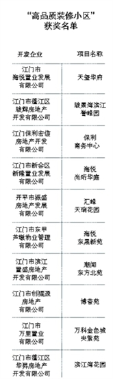 ????總的來說,在本次評選中,本地的幾個實力房企,如博富控股旗下的博學名苑和福美壹號名苑,海悅集團旗下的天璽華府、海悅尚珩華庭和海悅東晟新苑,錦富匯景灣豪庭,駿景灣集團旗下的駿景灣濱江譽峰園和駿景灣悅峰花園,怡福地產(chǎn)旗下的東華名岸園、星湖壹號院、博薈苑,以及半島華庭二沙島豪苑、潮聞東方北苑、翡翠觀瀾花園等,都名列前茅。另外,外來龍頭房企,如保利、碧桂園、粵海在江門的項目也榜上有名。